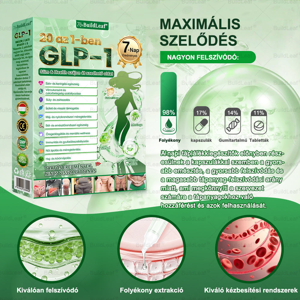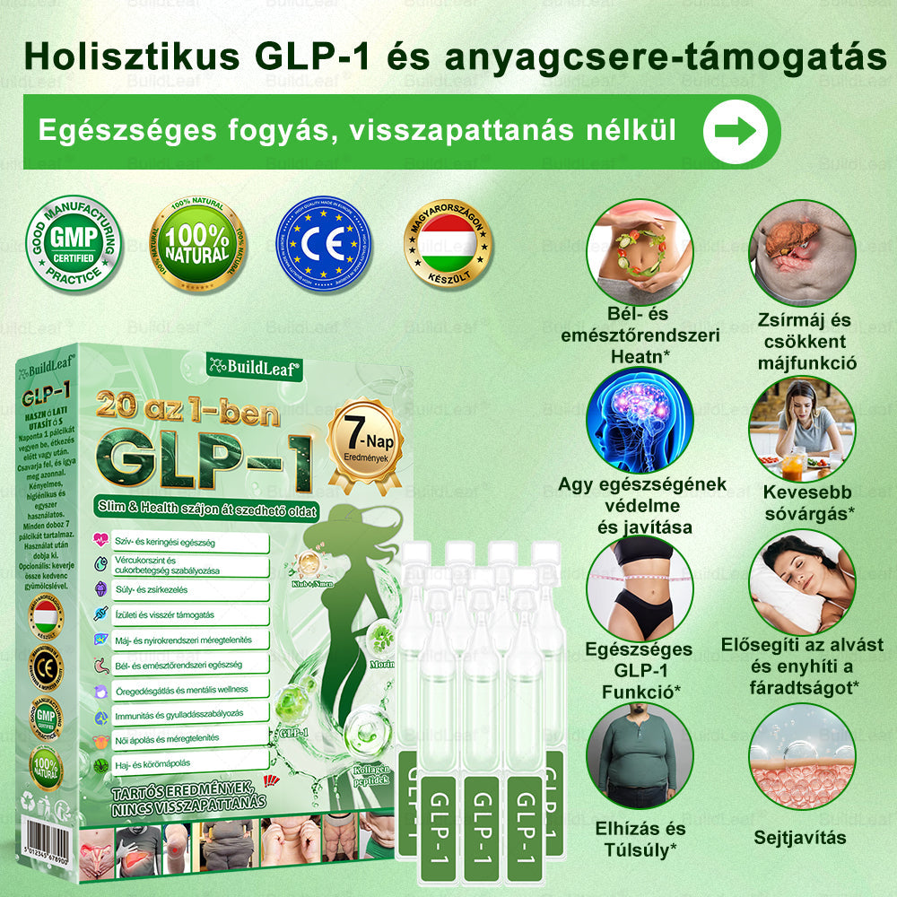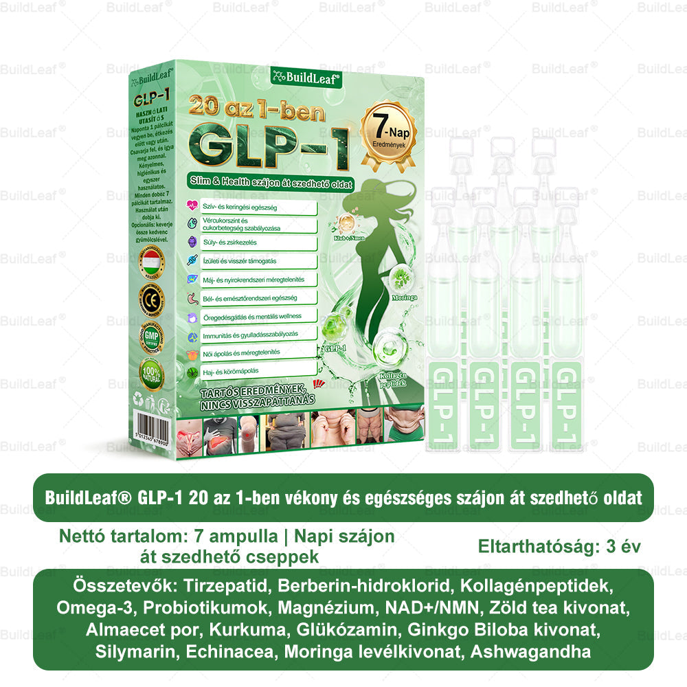 A BuildLeaf® GLP-120-in-1 Slim & Health szájon át szedhető oldatot több mint 20 évnyi kutatás eredményeként fejlesztették ki, több mint 30 szakértő részvételével, és minden felnőtt és minden testalkat számára készült. A Tirzepatidot (GLP-1) természetes kivonatokkal ötvözi a vércukorszint kiegyensúlyozására, az étvágy csökkentésére és a zsírégetésre a fokozatos, egészséges fogyás érdekében. Hozzáadott kollagénpeptidekkel támogatja a bőr feszességét a fogyás során. GMP-tanúsítvánnyal rendelkező létesítményekben, amerikai és uniós szabványok szerint készül, biztonságos, tudományosan alátámasztott, tűmentes megoldást kínál a hatékony testsúlyszabályozáshoz és a tartós egészséghez.